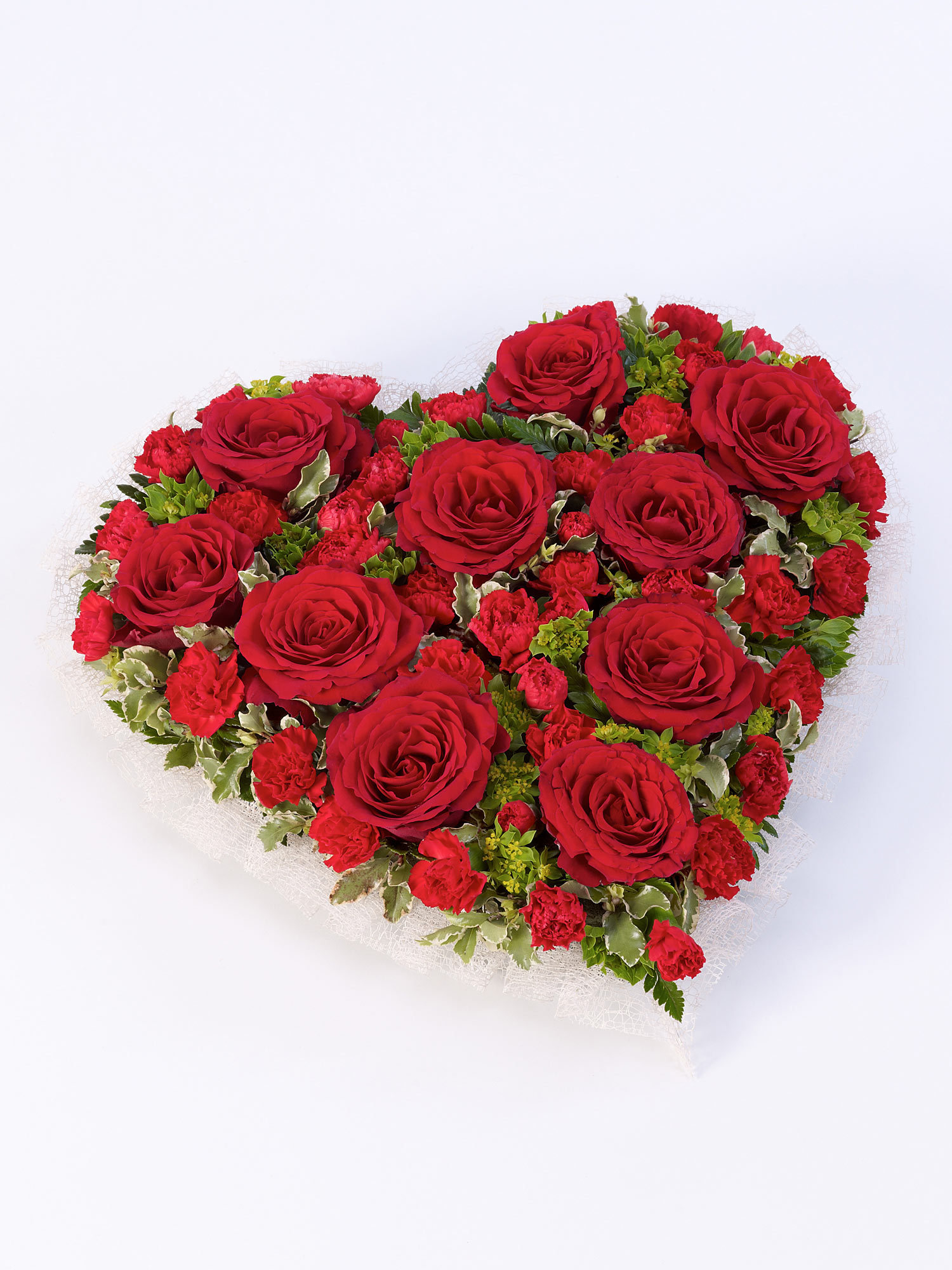 A traditional heart-shaped design including roses and spray carnations in rich red complemented by choice foliage.