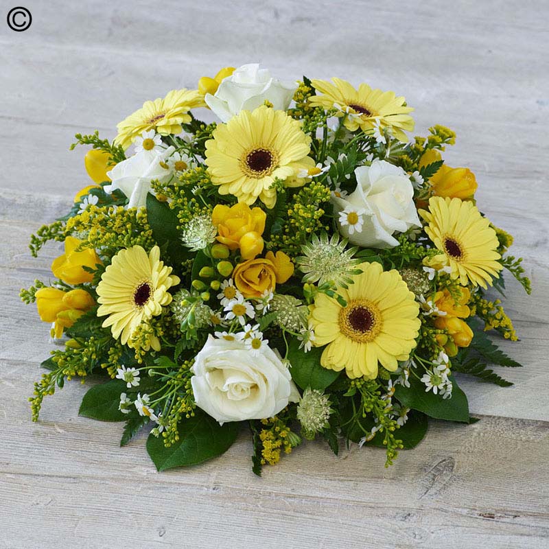 A pretty combination of fresh yellow and white blooms featuring germini, astrantia and fragrant freesias.